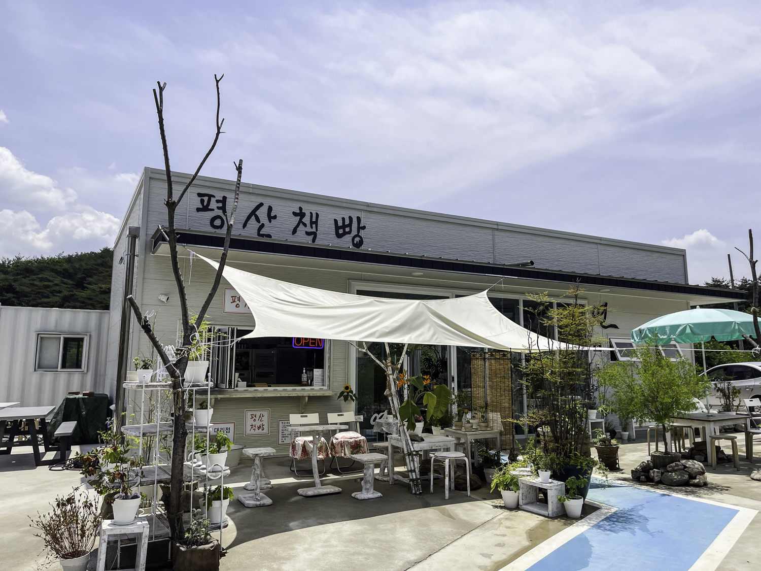 평산책방에도 차와 음료, 쿠키 등을 파는 '평산책사랑방'이 함께 있는데 하필 12:00~13:00 브레이크 타임에 걸려 근처 '평산책빵'이란 곳으로 왔습니다. 이곳은 평산책방과 전혀 관계가 없는 곳인데 주인장이 이름을 위트 있게 지어셨네요. 커피가 꽤 맛있었던 기억과 소담한 평산책방, 그리고 문통을 보지 못한 아쉬움과 화나는 확성기 소리를 가지고 평산마을을 빠져나옵니다.
