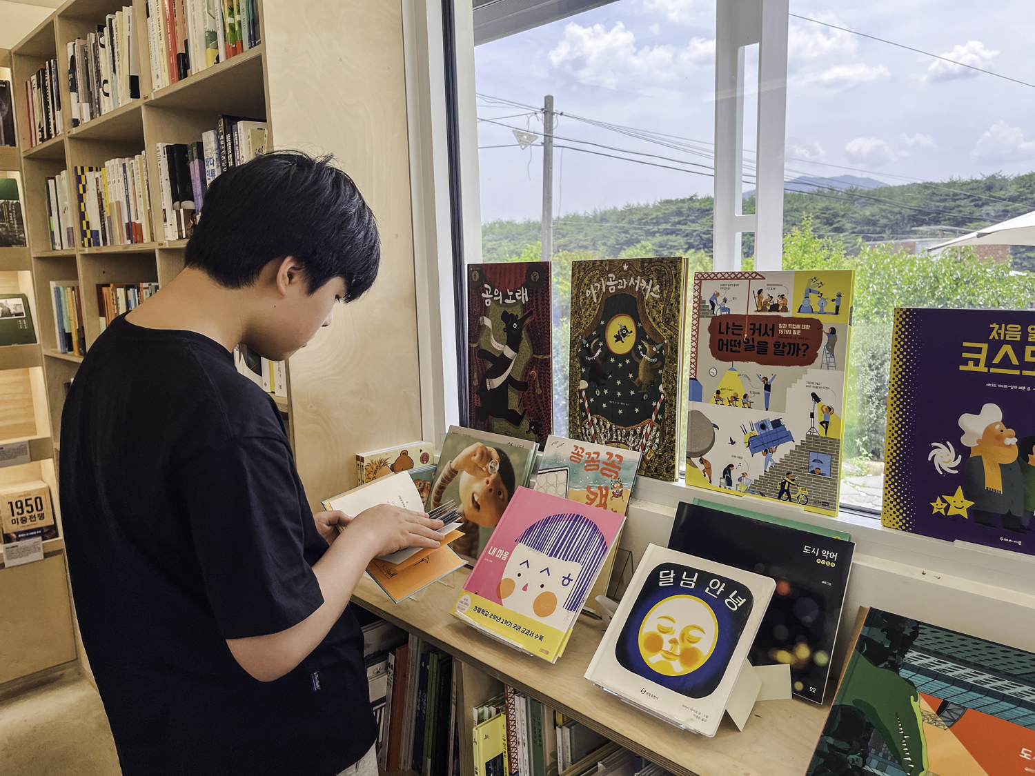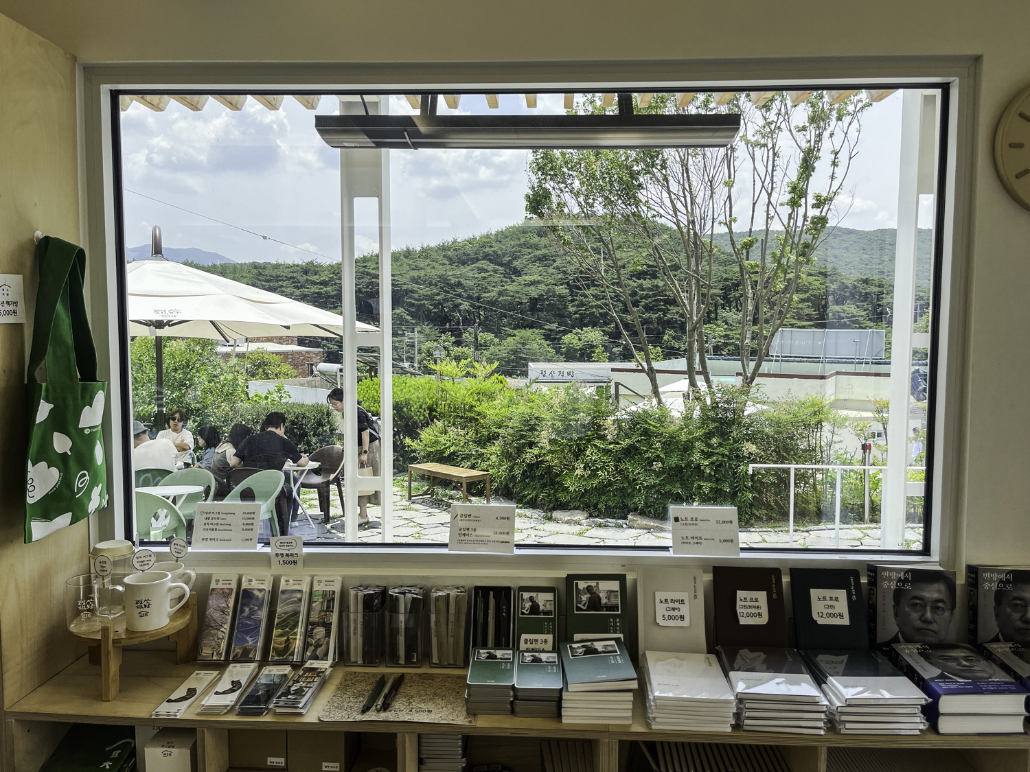 볕 좋은 날, 평산책방 통창을 통해 바라본 평산 마을 풍경입니다.