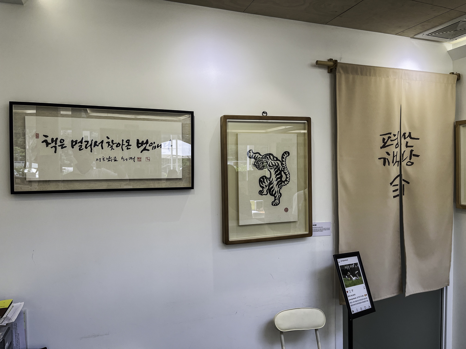 신영복 선생님의 '책은 멀리서 찾아온 벗입니다' 와 1980년대 현실주의 미술의 대표작가인 오윤 선생의 춤추는 호랑이 '무호도'가 눈에 띕니다.