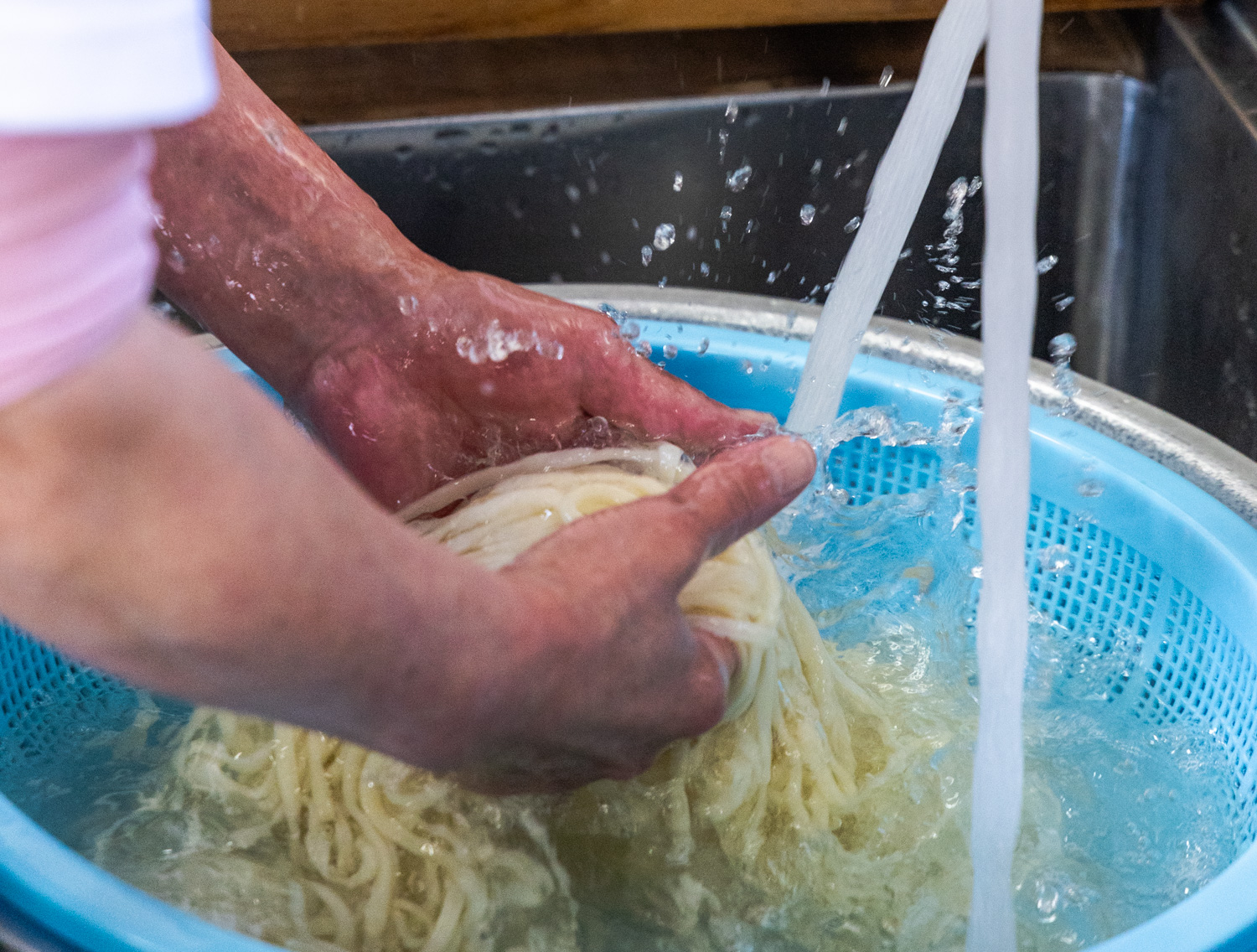 가케우동은 익힌 면을 찬물에 헹군 후 그릇에 담아줍니다. 반질반질 실크처럼 윤이 나는 면발입니다.
