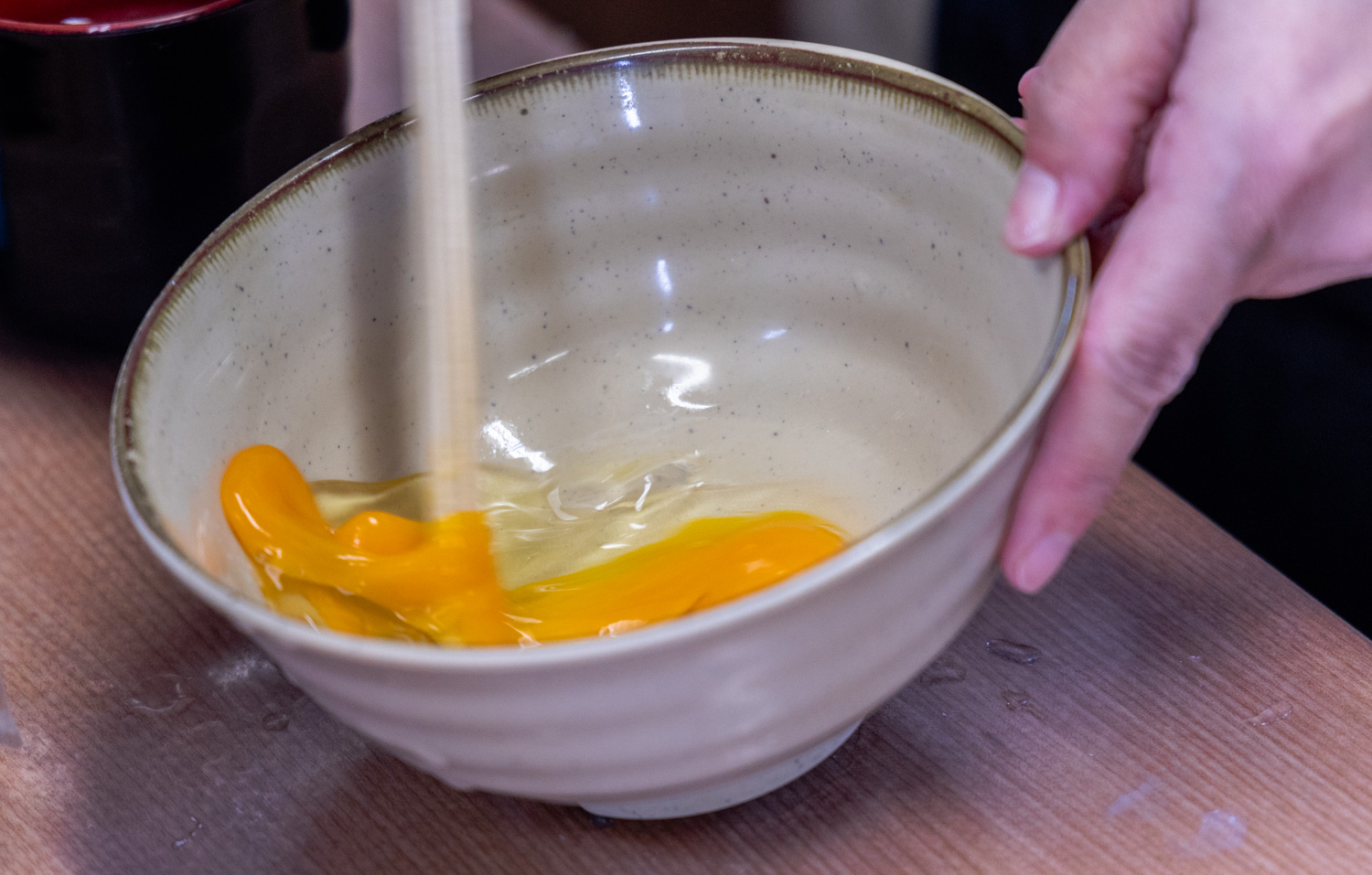 가마타마 우동은 그릇에 날달걀을 탁 깨어 넣고 잘 풀어 줍니다.