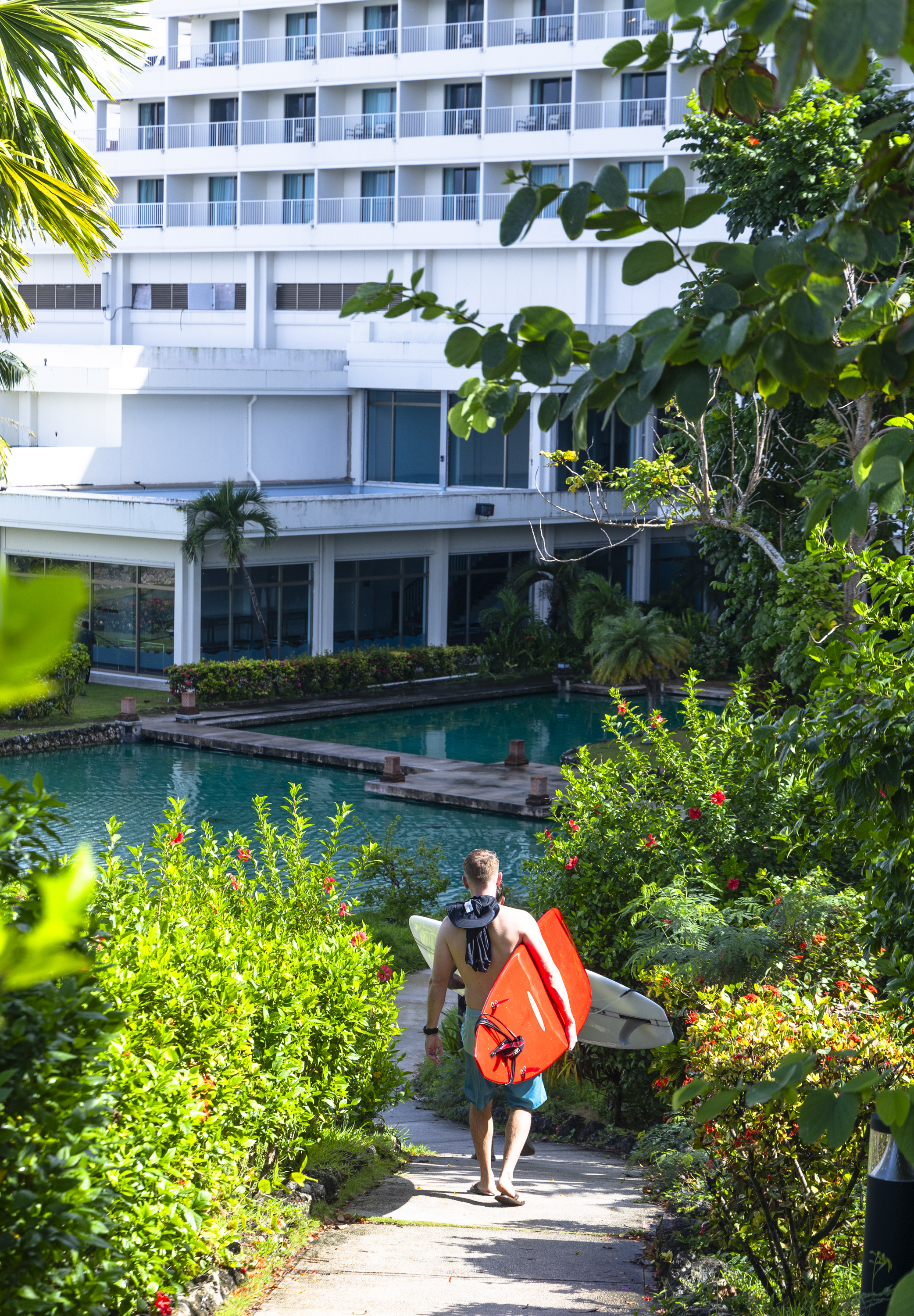 리조트는 프라이빗 공간인데 이렇게 막 다녀도 되나 싶었는데, 괌에서는 해변은 공공의 재산이며 해변접근이 법으로 보호되고 있다고 합니다. 그래서 호텔에서 보드를 들고 수영장 구역을 걸어 다니는 것에 대해 아무런 말도 하지 않는다고 합니다.